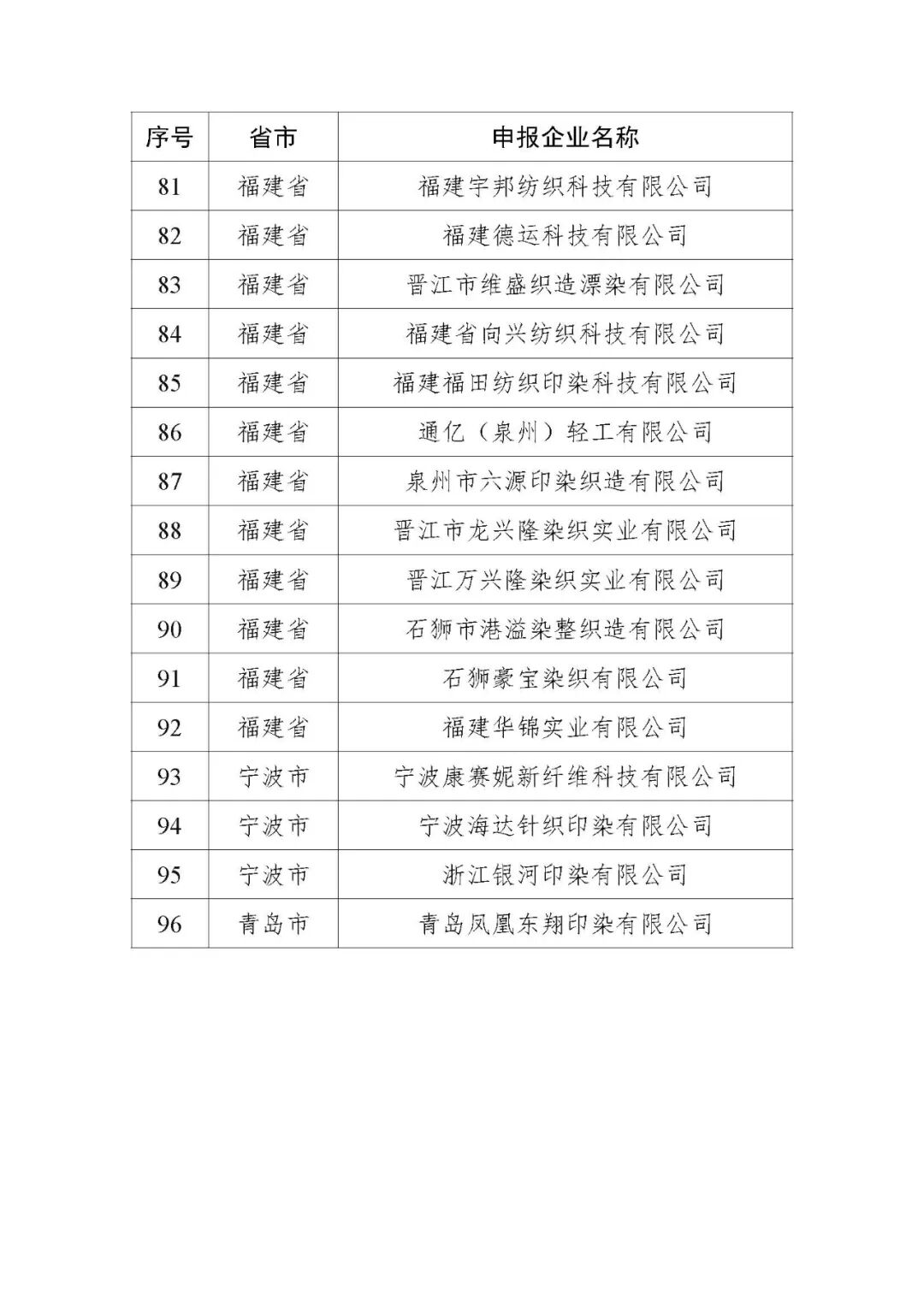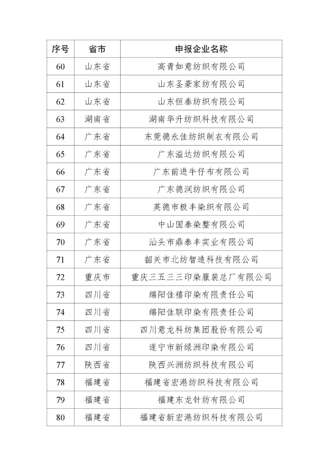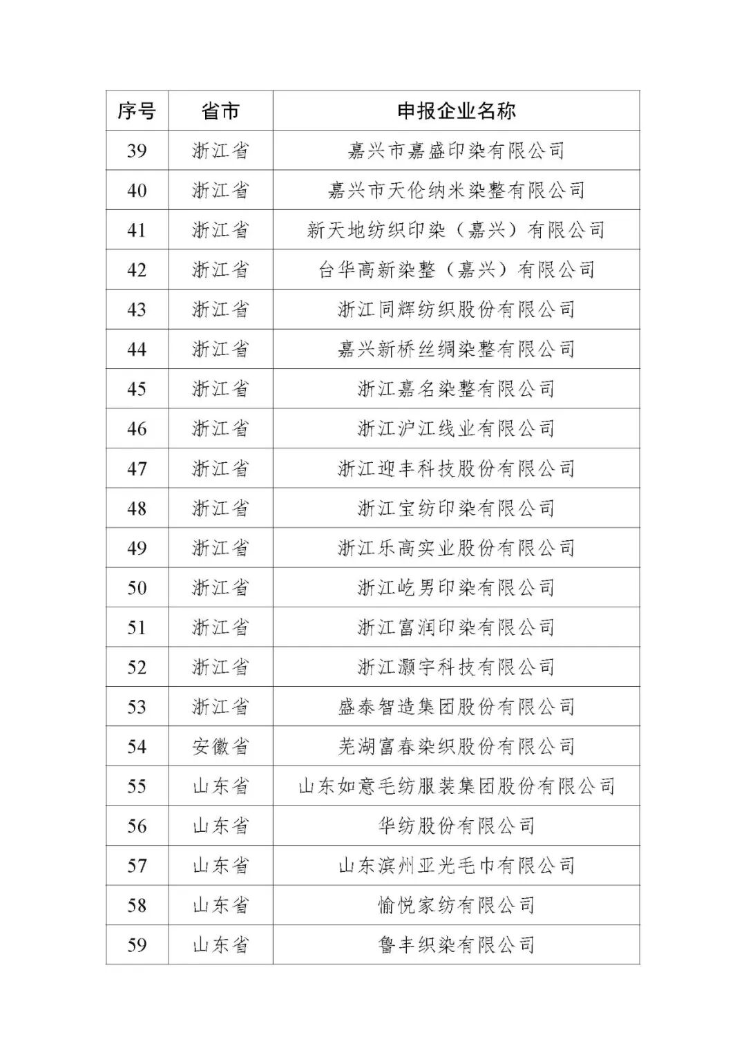 为贯彻落实《印染行业规范条件(2023版)》(工业和信息化部2023年第35号公告),推动印染行业结构调整和转型升级,引导行业高端化智能化绿色化发展,根据《印染行业规范公告管理办法》有关规定,我们今年组织开展了印染企业规范公告申报和复核工作。经企业自主申报、省级工业和信息化主管部门核实推荐、专家组评审、征求生态环境部意见等程序,形成了拟公告的符合《印染行业规范条件(2023版)》企业名单(第一批)。现予以公示。联系电话:010-68205660 010-68205661(传真)电子邮件:chenxuan@miit.gov.cn附件:拟公告的符合《印染行业规范条件(2023版)》企业名单(第一批)工业和信息化部消费品工业司