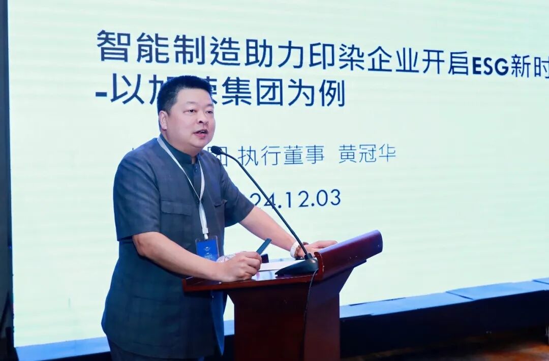 旭荣集团执行董事黄冠华以自身企业为例,作“智能制造助力印染企业开启 ESG 新时代”报告。他分享了旭荣集团数智化发展历程,公司通过数字化技术与智能化管理创新,逐步实现全产业链透明生产和全环节智能制造,并在减少碳排放、推动绿色生产、优化供应链管理等方面取得了显著成效,展现了企业的责任与担当。他的分享也为其他企业进行数字化转型与ESG实践提供启发。